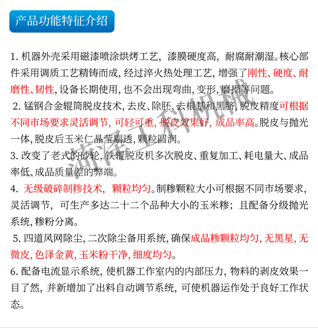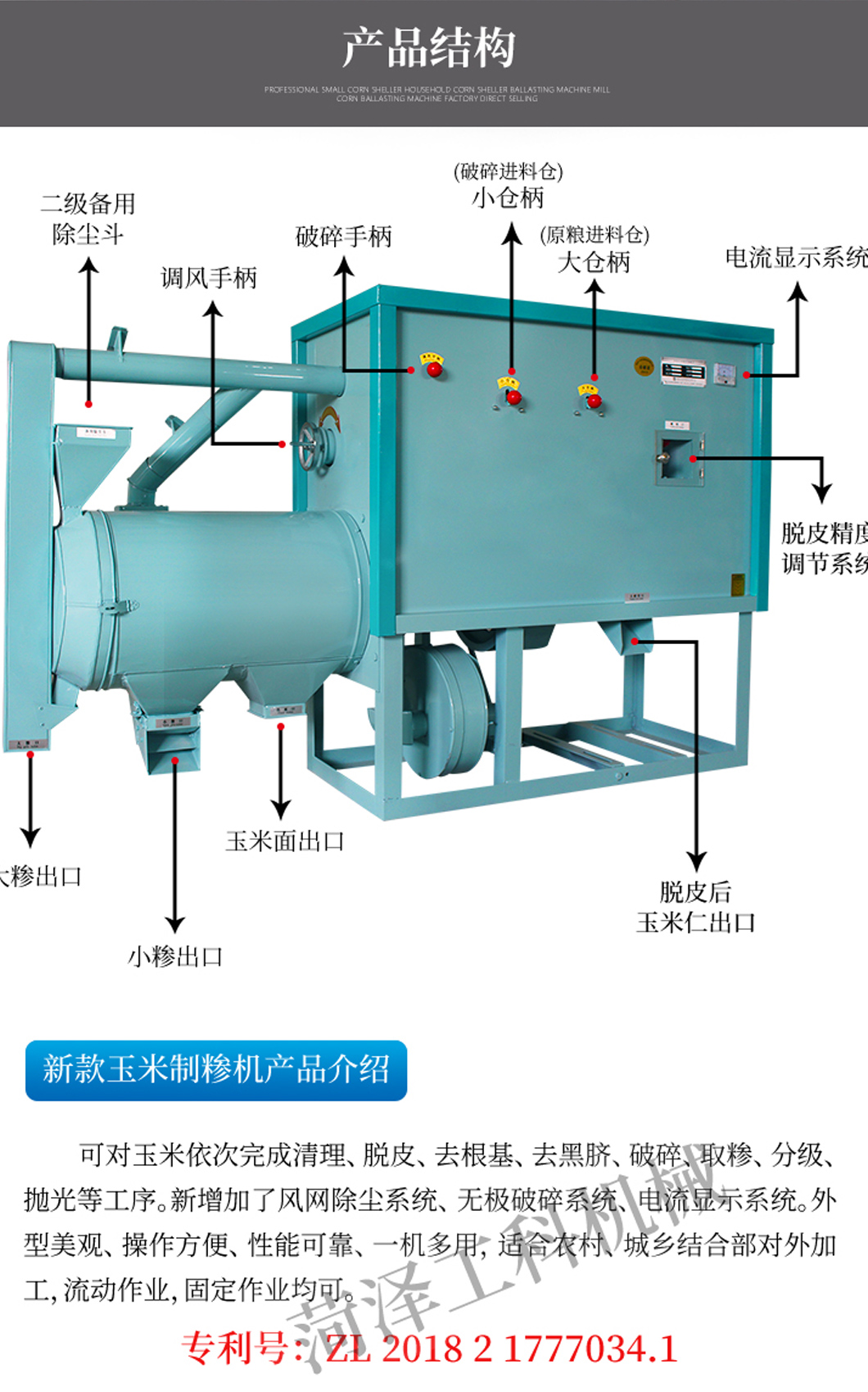 外型美觀、堅(jiān)固耐用、操作方便、性能可靠。加工工藝干濕兩用,可對(duì)玉米完成清理、脫皮、除胚、去根基、去黑臍、破碎、取糝、分級(jí)、拋光、清選等工序。能生產(chǎn)二十二個(gè)品種的成品糝。加工后的成品玉米糝可直接進(jìn)入大型超市和糧油批發(fā)市場(chǎng)。新增加了無級(jí)破碎系統(tǒng)、四道風(fēng)網(wǎng)除塵、二次備用除塵系統(tǒng)。大豆、水稻脫皮去殼均可。為本公司拳頭產(chǎn)品