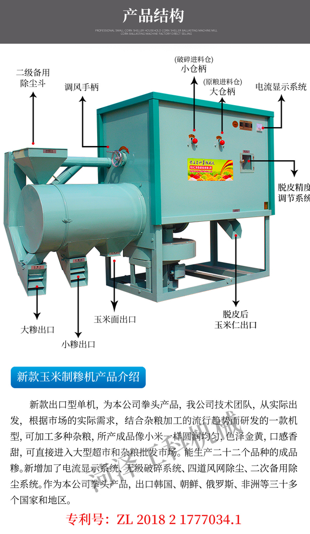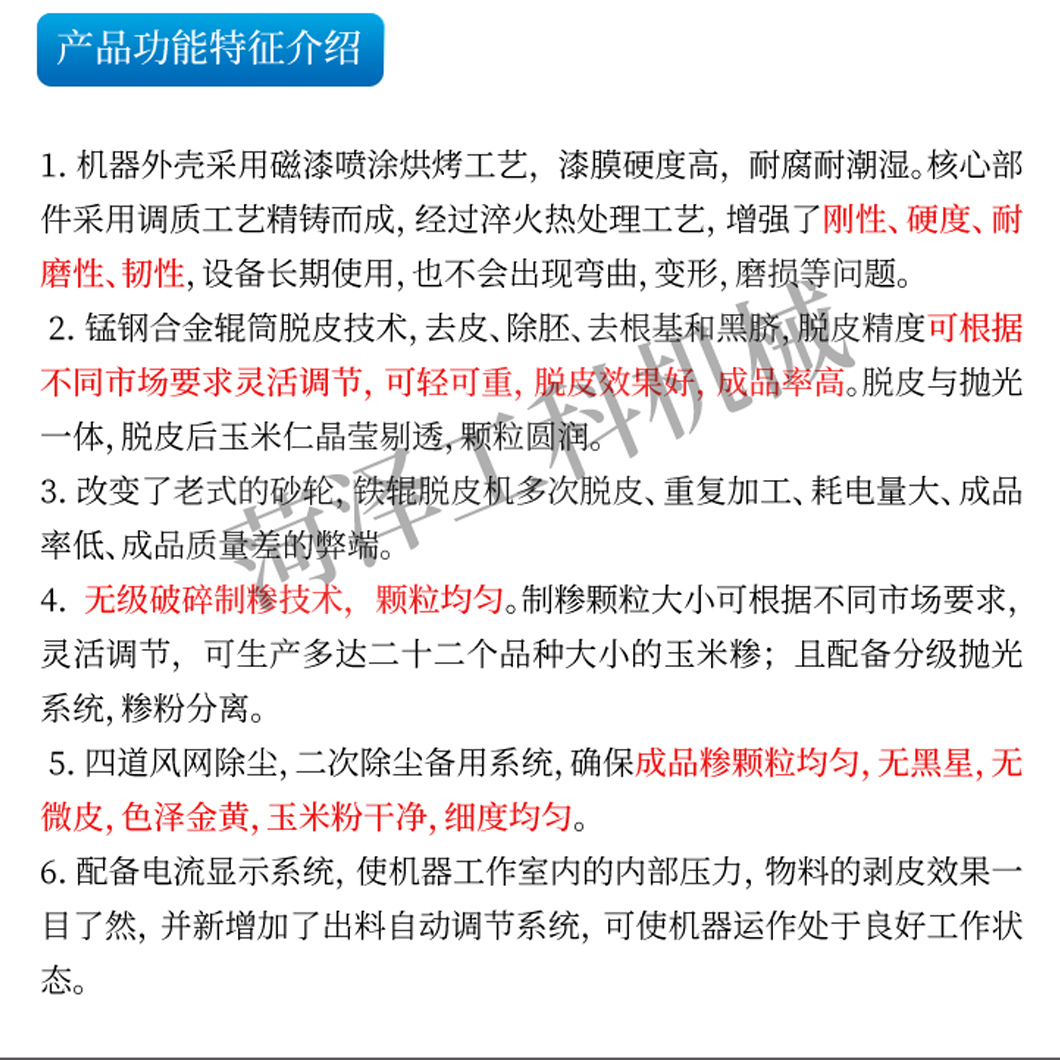 新款機型,其工藝先進、性能穩(wěn)定,所產(chǎn)成品像小米一樣顆粒均勻,色澤金黃,顆粒圓潤,口感香甜。可加工多種雜糧,加工工序一次性完成。 能生產(chǎn)二十多個品種的成品糝。新增加了電流顯示系統(tǒng)、無級破碎系統(tǒng)、四道風(fēng)網(wǎng)除塵、二次備用除塵系統(tǒng)。為本公司拳頭產(chǎn)品